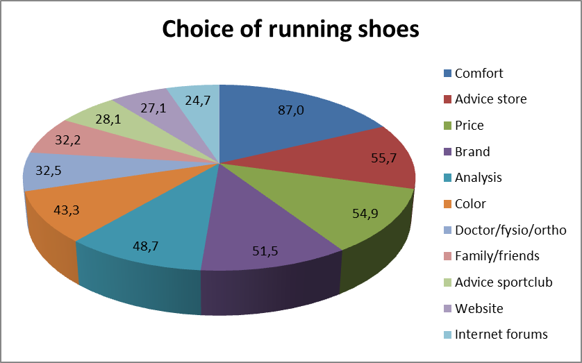 Het meest opvallende resultaat is voorgesteld door onderstaande figuur. Elke loper kon verschillende items aanduiden die hen beïnvloedden bij het kiezen van de juiste loopschoen. Het blijkt dat sporters zich het meest laten meeslepen door het eerste comfort'gevoel' in de winkel, onafhankelijk van eerdere blessures.